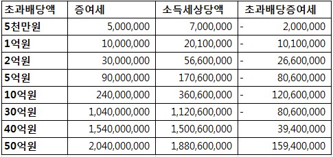 초과배당 금액에 따라 다음과 같이 증여세가 계산된다. 36억7천만원정도에서 증여세와 소득세상당액이 같아진다.